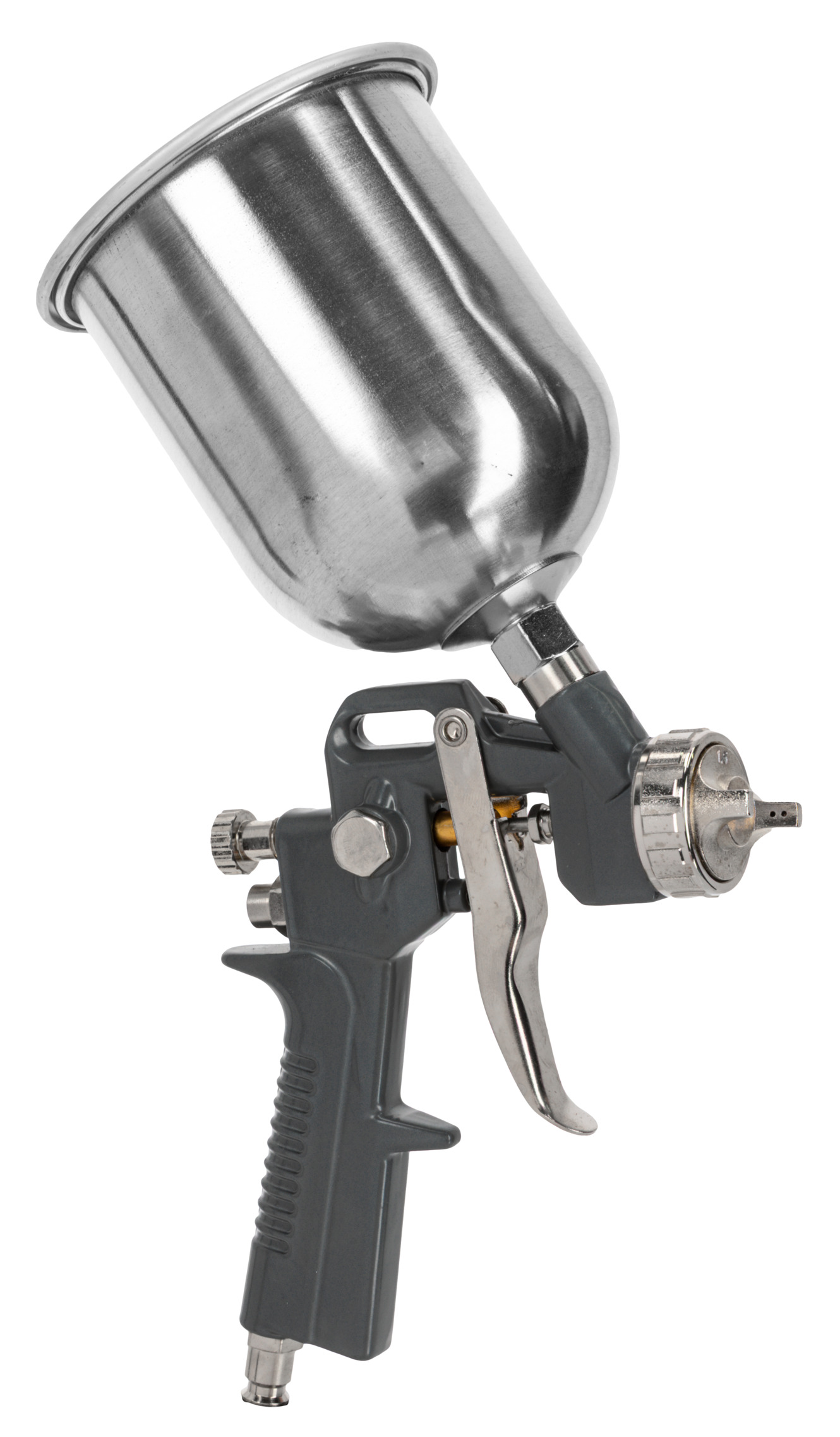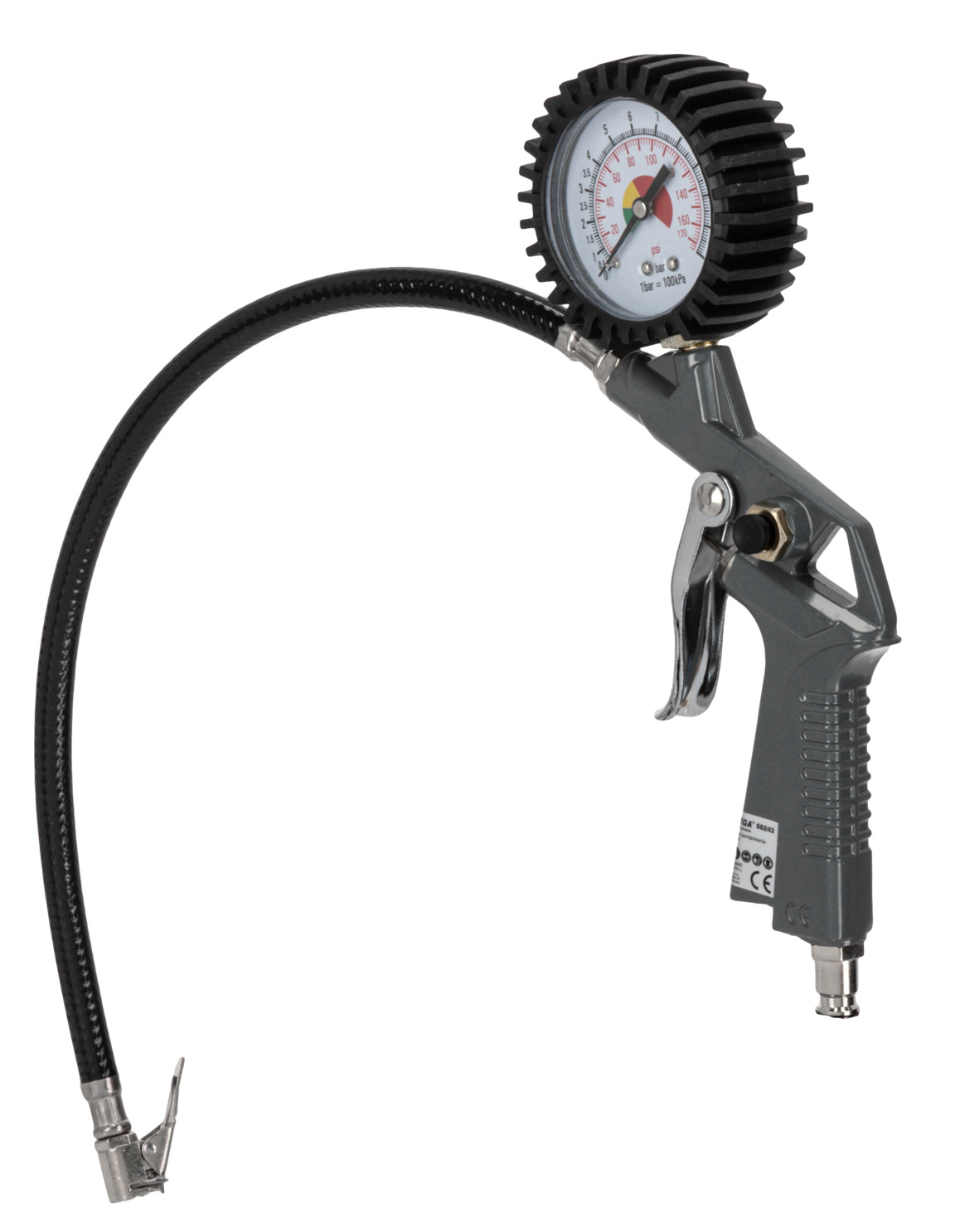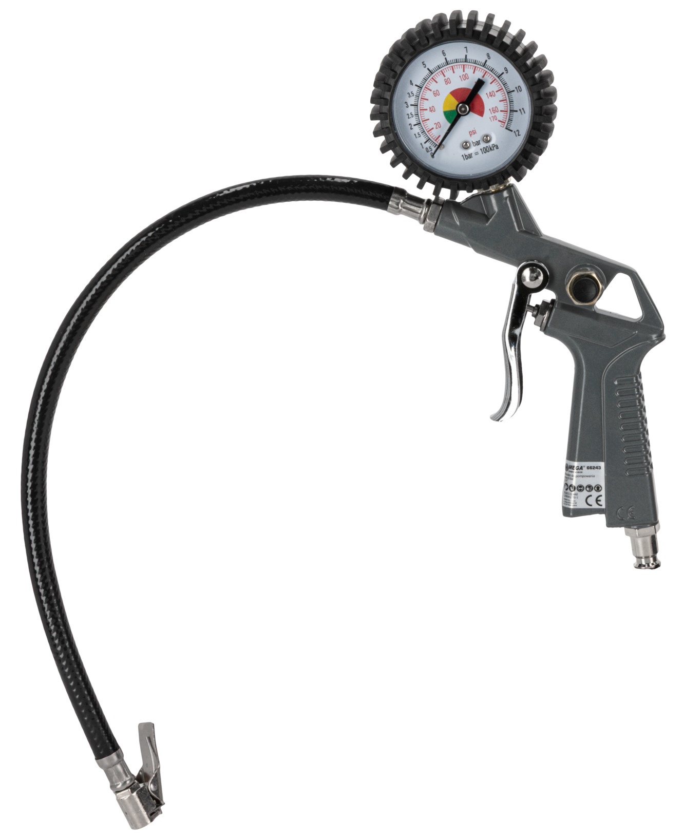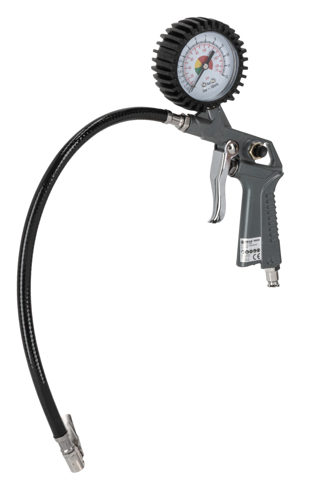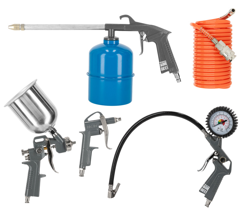 • Conţine: pistol pentru umflat cu manometru, pistol pentru suflat, pistol pentru spălat, pistol pentru vopsit cu rezervor superior, furtun aer spiralat 5 m